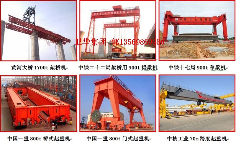卫华集团-河南卫华,主导产品为各类桥门式起重机、港口起重机及轻小型起重设备,具备生产起重量900t及以下通用桥门式起重机的能力,尤其在800t以下起重机产品上具备较强的市场竞争力,为许多行业设计制造了技术含量高、专业性强、结构复杂的起重设备,许多产品在原设计标准上进行了较大的改进、优化和创新。公司已生产并向各行业提供的产品有:5~800t桥式起重机;5~600t低净空、低轮压桥式起重机(欧式);100~320t冶金桥式起重机;具备上旋或下旋转功能的各类电磁吸盘(挂梁)起重机;80~500t电站厂房用全变频桥式起重机;远程控制、全程序化运行的垃圾焚烧电厂用起重机;起重量达800t、大跨度、高起升、具有船体翻转功能的造船用门式起重机;440t全变频盾钩门机;45t轨道式集装箱门式起重机;超高卷扬400m坑道门式起重机;50~100t板坯夹钳起重机;50~1700t架桥机、移梁机;斗轮堆取料机;输送机;破碎筛分设备;各类水利机械:启闭机、坝顶门机、拦污栅等;国内第一台全智能坦克冲击试验台以及卫星发射中心密封舱坠落试验装置以及ND型系列电动葫芦、HD型电动单梁等,其中低净空、低轮压桥式起重机(欧式)、超高起升高度起重机、ND型系列电动葫芦、HD型电动单梁处于国内领先水平,充分体现了公司的产品研发和制造能力。